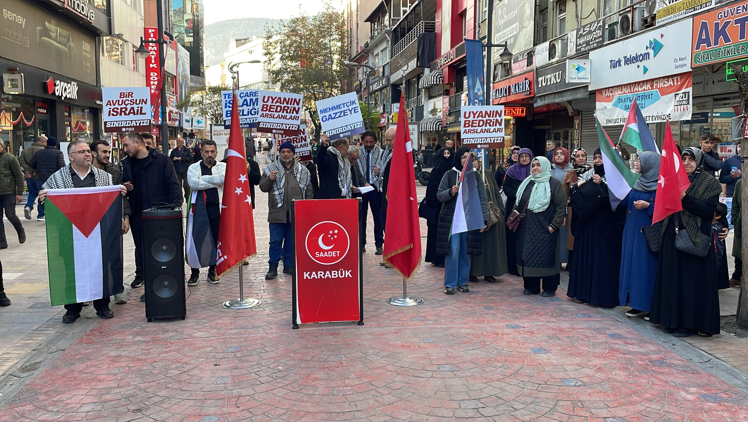 Saadet Partisi İl Başkanlığı önünde toplanan vatandaşlar, İsrail güçlerinin 7 Ekim’de başlattığı Gazze saldırılarını protesto etti. Ellerinde Filistin bayrakları ve pankartlar ile İsrail aleyhine sloganlar atan grup adına basın açıklaması yapan Saadet Partisi Karabük Merkez İlçe Başkanı Abdullah Yusuf Tekoğlu, İsrail’in işgalinin tüm şiddetiyle devam ettiğini, çocuk, kadın, yaşlı ve hasta demeden binlerce Filistinlinin katledildiğini söyledi.