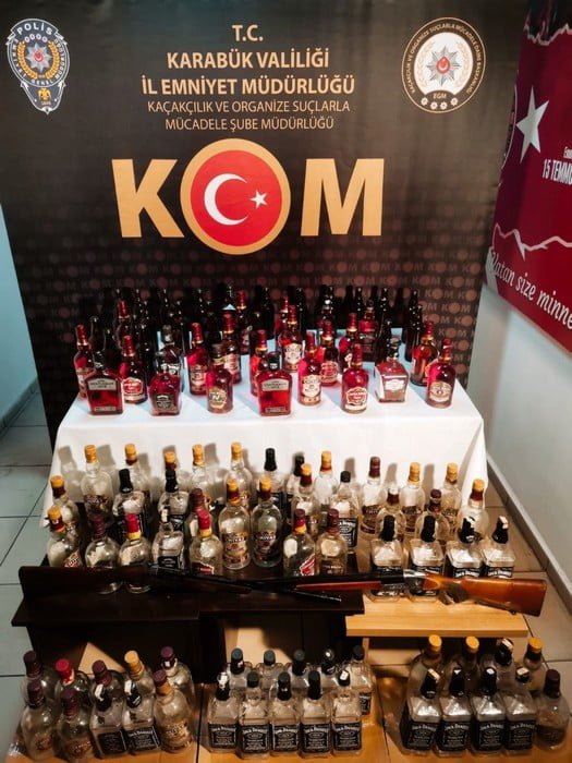 Adreslerde yapılan aramada, farklı markalarda gümrük kaçağı 100 viski, 203 boş viski şişesi, çok sayıda viski kapağı ve jelatini ile 3 litre el yapımı viski ve 2 ruhsatsız av tüfeği ele geçirildi, zanlılar M.K. ve R.S. gözaltına alındı.