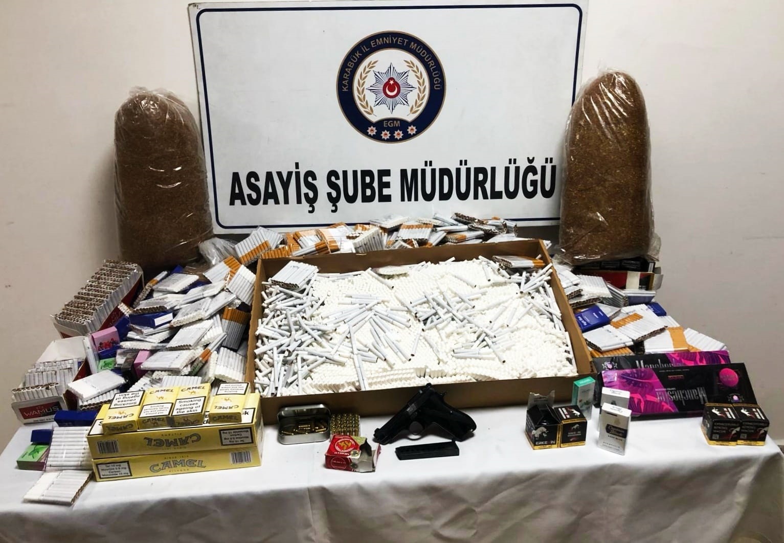 Operasyonda, ruhsatsız tabanca ve tabancaya ait şarjör ile 42 mermi, 6 bin 978 makaron, 12 paket bandrolsüz sigara, 240 dal sigara ve 3 cinsel içerikli macun ele geçirildi.