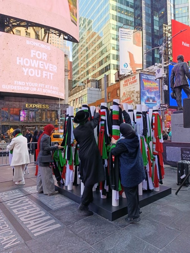 Enstalasyon ve basın açıklamasından oluşan etkinlikte; direklere asılı Filistin bayrağı renklerindeki fularlar, Gazze’de katledilen kadınları sembolize etti. Fularların bağlandığı direklerde yer alan ve Filistinli kadınların geleneksel el işi tatreez ile oluşturulmuş Filistin bayrağı ise, Filistinli kadınların direnişini vurguladı. Direklere bağlanmış fularlar alındıkça, tatreez işlemeli Filistin bayrağı ortaya çıktı. Böylece vicdan sahibi ABD’lilerin de katılımıyla Times Meydanı’ndan “Filistinli kadınların yanındayız” mesajı verildi.