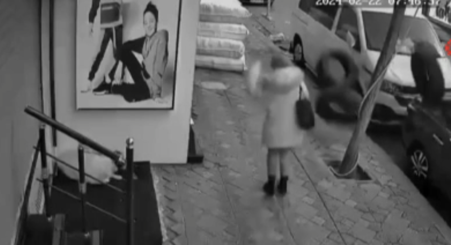 Güvenlik kamerasına yansıyan görüntüde lastiklerin kaldırımda yürüyen kadının yanına düştüğü ve araçlara çarptığı görülüyor.