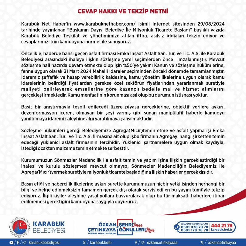 Karabük Belediyesi, Karabük Net Haber‘in 29/08/2024 tarihinde yayınladığı “Başkanın Dayısı Belediye İle Milyonluk Ticarete Başladı” başlıklı yazıda yer alan iddialara karşı cevap verdi. Belediyeden yapılan açıklamada, haberde bahsi geçen asfalt firması Emka İnşaat Asfalt San. Tur. ve Tic. A.Ş. ile yapılan ihalenin yerel seçimlerden önce imzalandığı ve işin %50’sinin seçimden önce tamamlandığı belirtildi. Belediyenin şeffaflık ve hesap verebilirlik ilkesine uygun olarak kamu ve özel sektör fiyatlarından yararlanarak maliyet belirlediği vurgulandı.