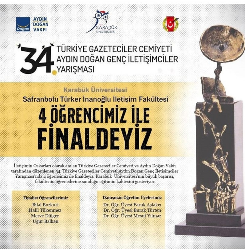 İletişimin Oskarları olarak anılan, Türkiye Gazeteciler Cemiyeti ve Aydın Doğan Vakfı tarafından düzenlenen 34. Türkiye Gazeteciler Cemiyeti Aydın Doğan Genç İletişimciler Yarışması’nda Karabük Üniversitesi’nden 4 öğrenci finale kalmayı başardı. Bu başarı, üniversitenin öğrencilere sunduğu eğitimin kalitesini ortaya koyuyor.