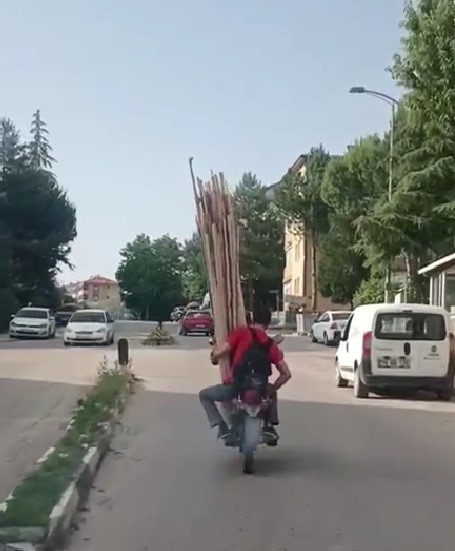 Bağlar Caddesi’nde plakasız motosikletle seyir halinde olan sürücü ve arkasındaki kişi, boyları 3 metreyi bulan çıtaları kucaklayarak taşıdı. Trafikte tehlikeye davetiye çıkarılan o anlar ise arkadan gelen araçtaki yolcunun cep telefonu kamerasına yansıdı. Motosikletteki tehlikeli taşımanın akıbeti ise görüntülerin sona ermesiyle bilinmiyor.