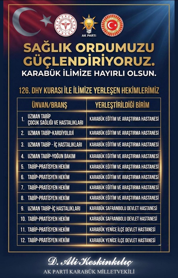 AK Parti Karabük Milletvekili Ali Keskinkılç, sosyal medya hesabından yaptığı açıklamada, “İlimizde görev yapacak hekimlerimize başarılar diliyor, yapılan bu atamaların Karabük’ümüze ve kıymetli hemşehrilerimize hayırlı olmasını temenni ediyorum. Güçlü kadro, güçlü sağlık hizmeti. Karabük’e hayırlı olsun,” dedi.
