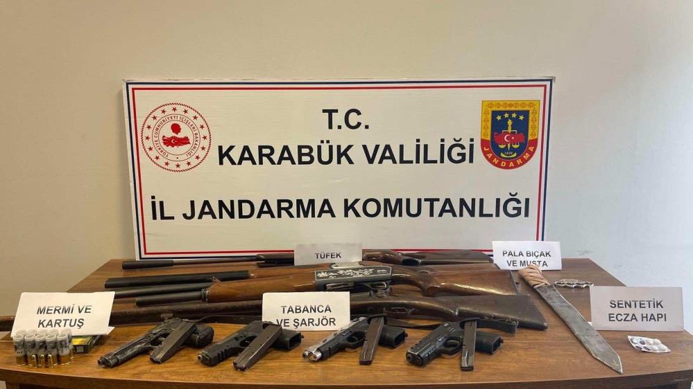Aramada, 1 ruhsatsız tabanca, 3’er adet kuru sıkı tabanca, ruhsatsız av tüfeği, birer adet havalı tüfek, pala olarak tabir edilen kesici alet, muşta, 3 adet 9 milimetre fişek, 10 adet 12 cal. fişek, 4 adet neurontin 600 mg sentetik uyuşturucu hap ele geçirildi.