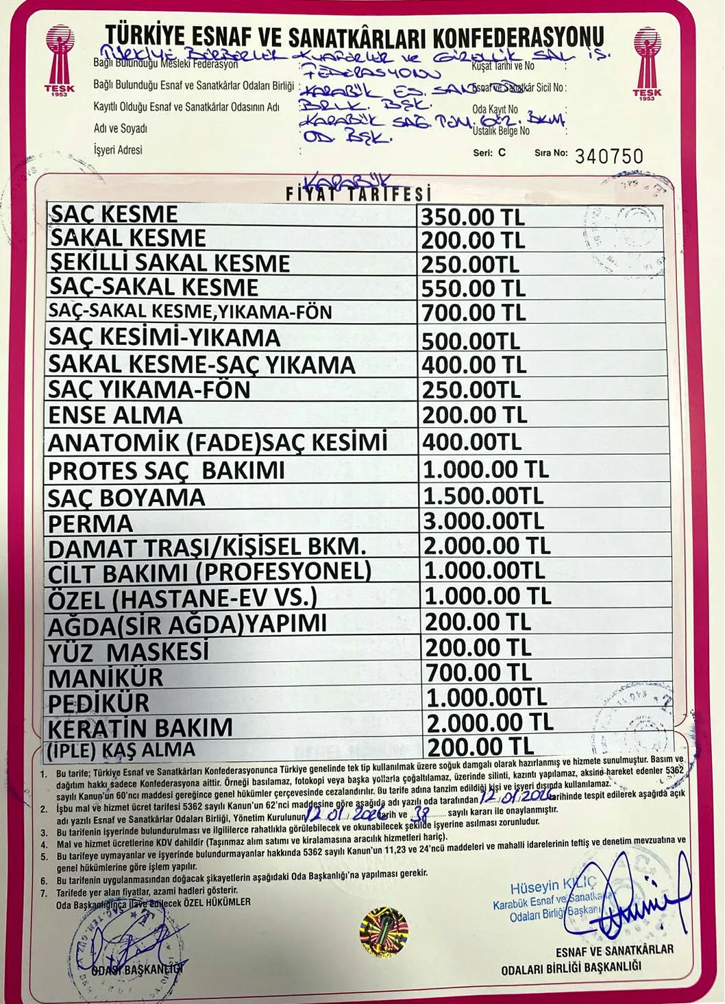 Karabük Berberler ve Kuaförler Odası tarafından belirlenen yeni tarife, kent genelindeki berber ve kuaförlerde uygulanmaya başlandı. Artan giderler nedeniyle yapılan fiyat güncellemesi, hem esnafı hem de vatandaşları yakından ilgilendiriyor.