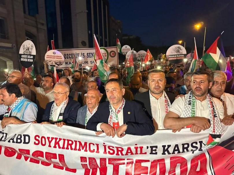 Birinci Dünya Savaşı’ndan sonra 1917’de Osmanlı Devleti’nin Kudüs’ten çekildiği gün siyonizmin oyunlarının başladığını söyleyen HAK-İŞ Genel Başkanı Mahmut Arslan ise 1948’de siyonistlerin terör devleti kurduğunu aktararak şunları söyledi: “İsrail’i kuran bütün örgütler terör örgütüydü. Onun için sakın 7 Ekim’den falan başlatmayın Filistin direnişini. 107 yıllık bir geçmişi var. Emperyalizmin kazananları, İngilizlerin oyunuyla Filistin toprakları, siyonistlere peşkeş çekildi. Biz oradan gittik zulüm başladık. Dört asır o topraklarda barış ve kardeşliği inşa etmiş, farklı dinlerin bir arada barış içinde yaşamasını sağlamış Osmanlı’nın bir eyaletidir. Bu topraklar mukaddes topraklardır. Buraya sırtımızı dönemeyiz. Bize nedir diyemeyiz. İnancımızın gereği orada olmak zorundayız. Tarihin bize yüklediği büyük bir sorumluluk var. Dört asır o toprakların tapusu elimizde. Bize ne diyemeyiz.”