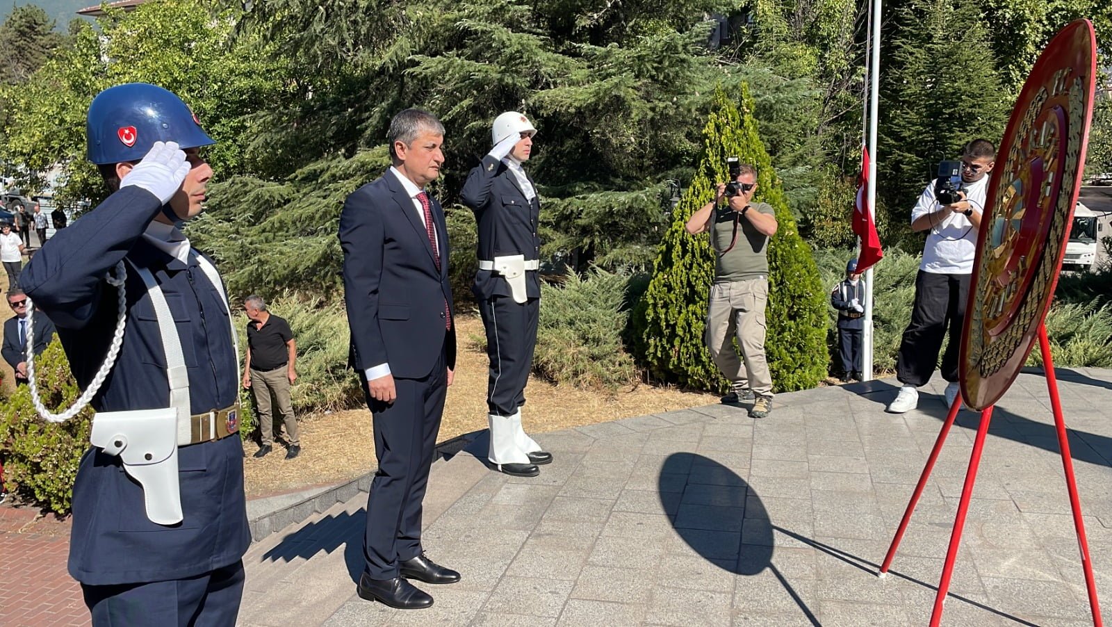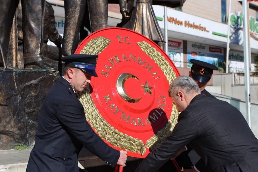 Safranbolu’da Misak-ı Milli Demokrasi Meydanında düzenlenen çelenk sunma töreninde Safranbolu Kaymakamı Şaban Arda Yazıcı ve Safranbolu Belediye Başkan Vekili Halil Bakkal tarafından Atatürk Anıtı’na çelenk bırakıldı.