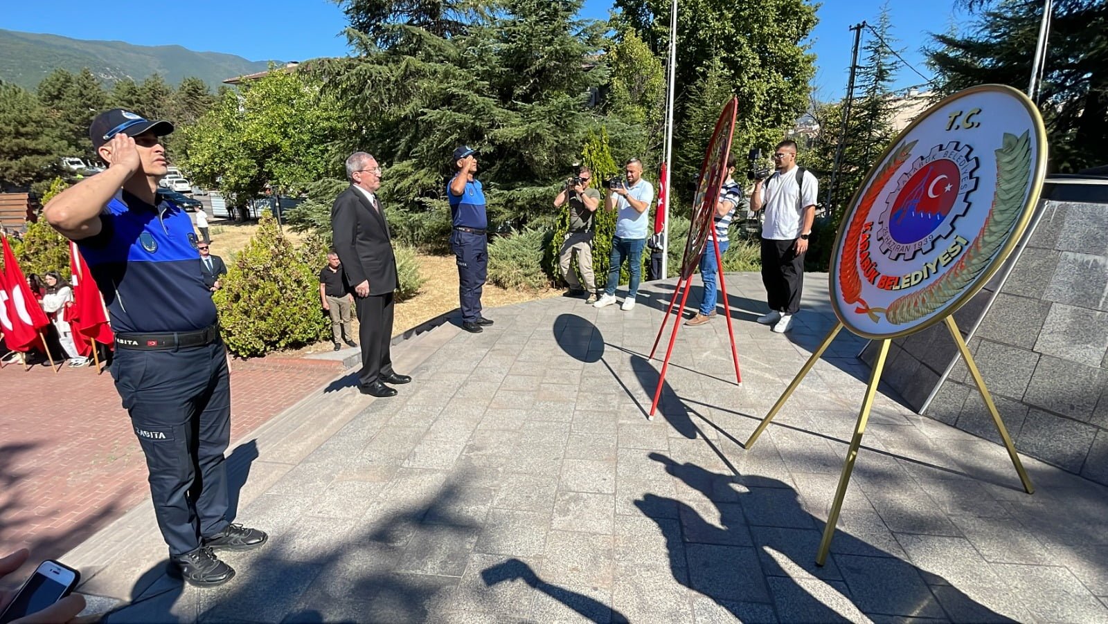 Safranbolu’da Misak-ı Milli Demokrasi Meydanında düzenlenen çelenk sunma töreninde Safranbolu Kaymakamı Şaban Arda Yazıcı ve Safranbolu Belediye Başkan Vekili Halil Bakkal tarafından Atatürk Anıtı’na çelenk bırakıldı.