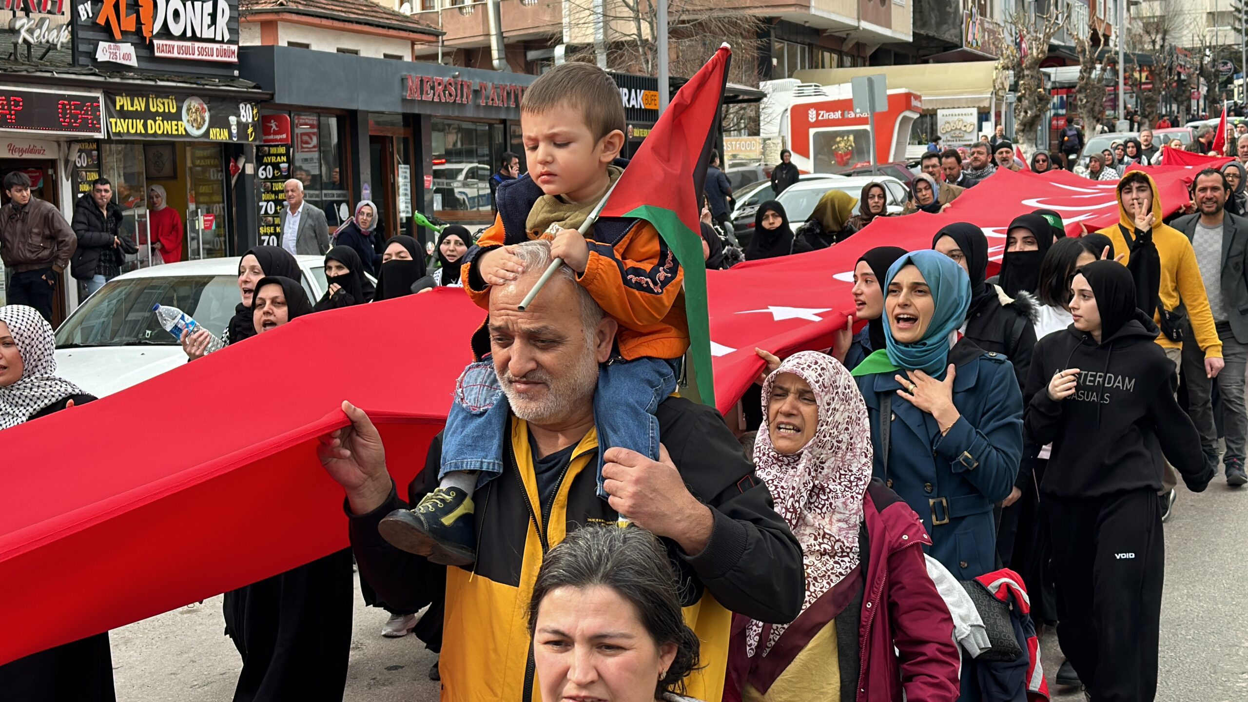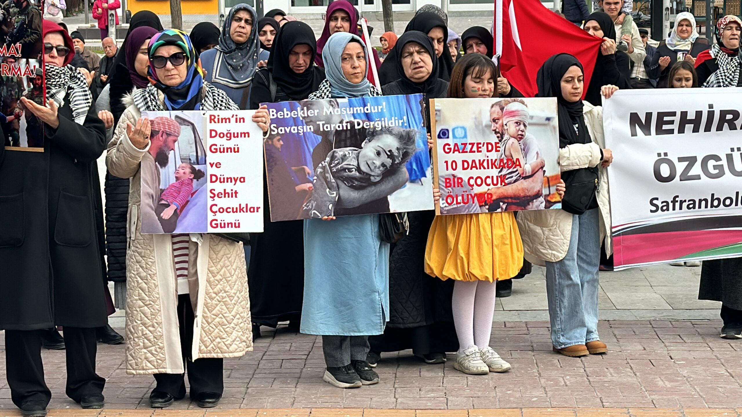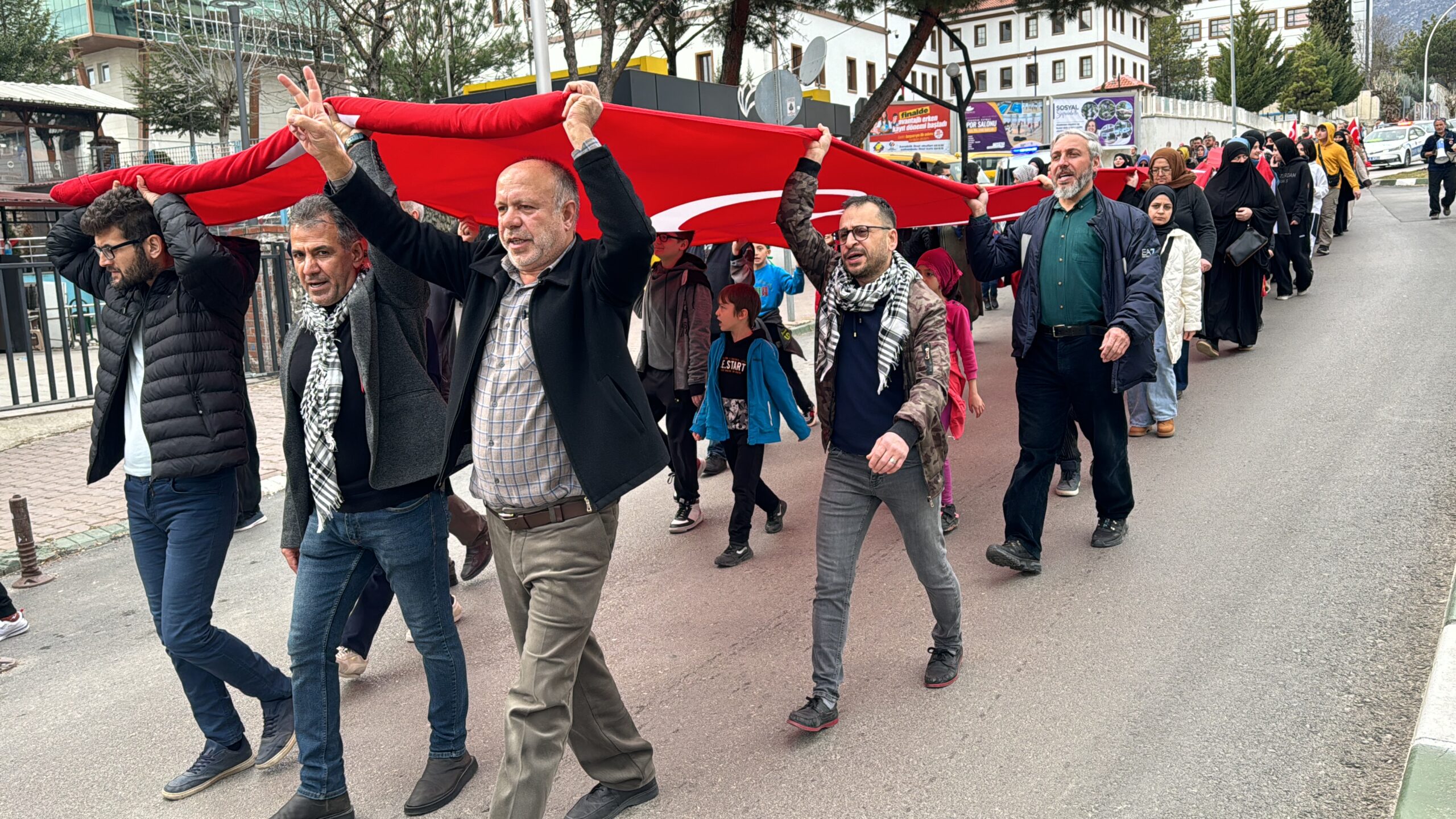 Ellerinde Türkiye ve Filistin bayrakları taşıyan katılımcılar, İsrail aleyhine slogan attı, sık sık tekbir getirdi.