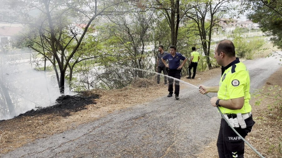 Olay yerine gelen polis ekipleri, hortumla su tutarak yangının büyümesini engelledi.