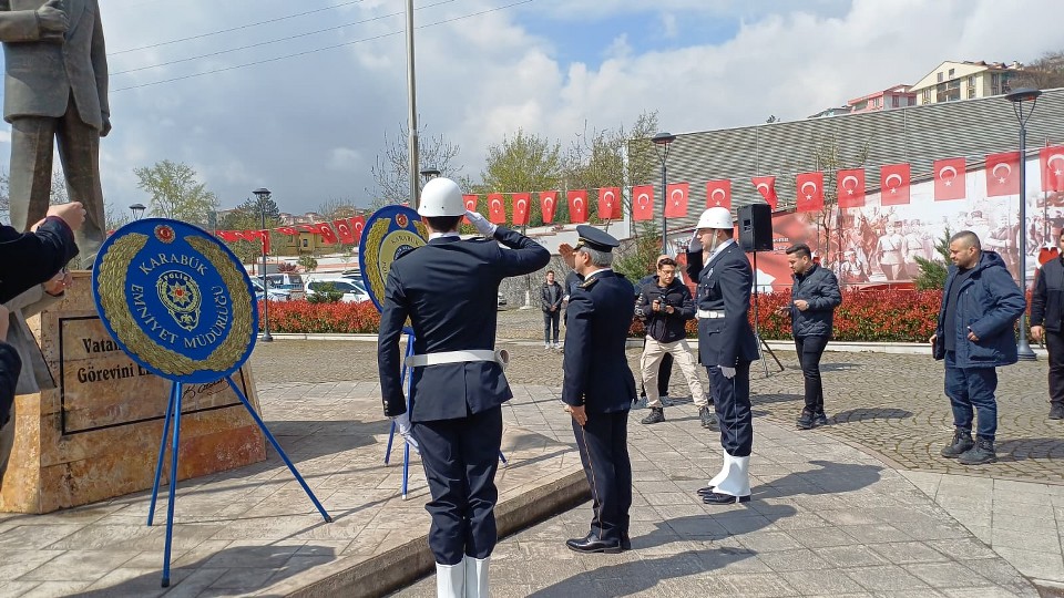 Karabük İl Emniyet Müdürlüğü, Türk Polis Teşkilatının 181. yıl dönümünü Atatürk Anıtı’nda düzenlediği anlamlı bir törenle kutladı. Törenin ilk bölümünde Karabük İl Emniyet Müdür Vekili Erdem Kadıoğlu, Emniyet Müdürlüğü çelengini Atatürk Anıtı’na sundu. Ardından Polis Meslek Eğitim Merkezi (POMEM) Müdürü Koray Yalınkaya, POMEM çelengini sunmak üzere anıta çelenk bıraktı.