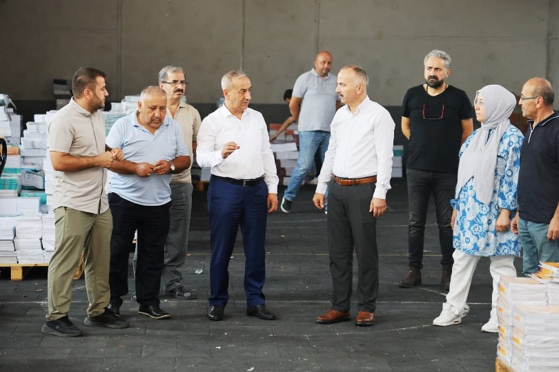 Karabük Merkez Mimar Sinan Ortaokulu deposunda bulunan ders kitaplarını yerinde inceleyen Karabük İl Millî Eğitim Müdürü Nevzat Akbaş, Şube Müdürü Metin Aktaş’tan ders kitaplarının dağıtım planı hakkında bilgi aldı.