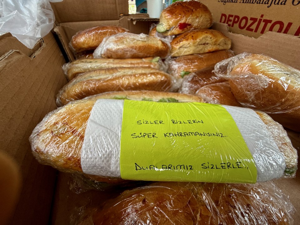 Bölge halkı, elleriyle hazırladıkları poğaça, kek, börek, sarma ve sandviç gibi atıştırmalıkların yanı sıra not kağıtlarına yazdıkları anlamlı mesajlarla da sahada görevli personele moral veriyor.