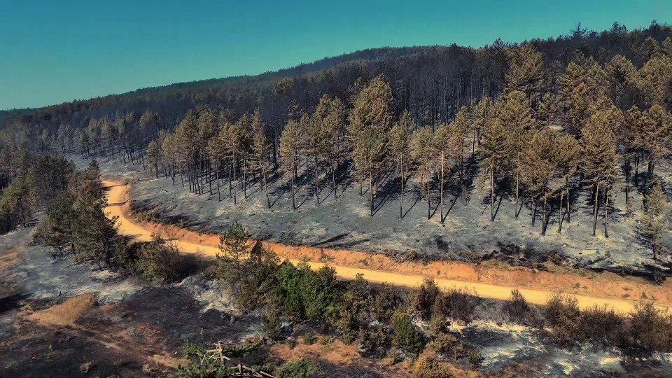 Havadan çekilen görüntülerde, yangının etkili olduğu bölgelerde yeşil ormanlık alanların yerini siyah kül örtüsünün aldığı görüldü. Alevlerin etkisiyle geniş bir alanın zarar gördüğü yangın sonrası geriye acı bir manzara kaldı.