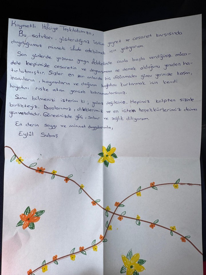 “Siz yalnızca alevleri söndürmediniz. Umudumuzu, doğamızı, nefesimizi de korudunuz. Her adımınızda cesaret, her nefesinizde umut vardı. Size borçluyuz.”