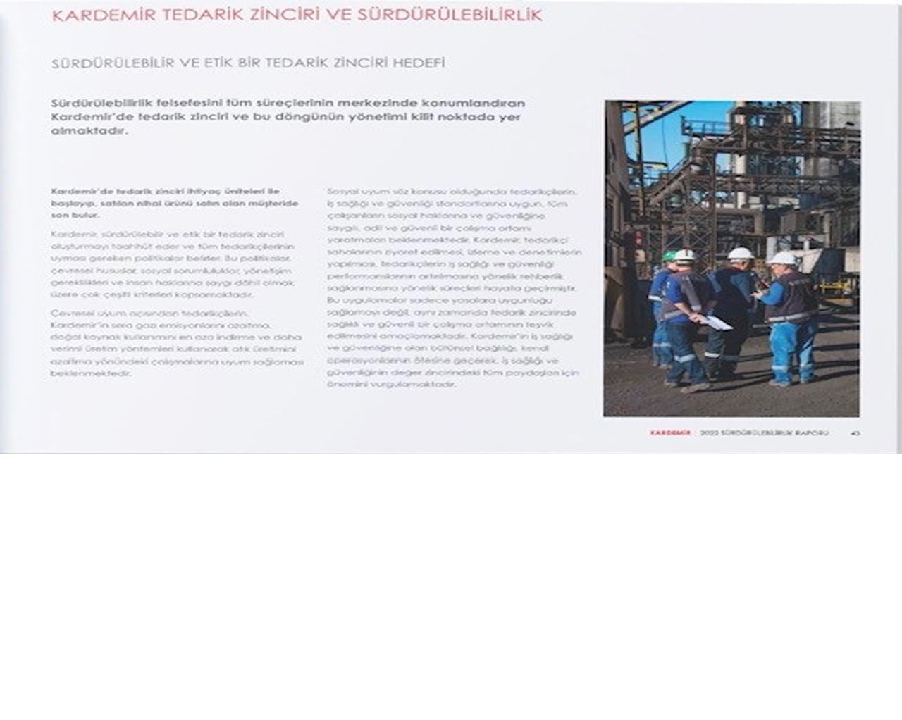 KARDEMİR’in, 2022 yılı raporunda sürdürülebilirlik felsefesini tüm süreçlerinin merkezinde konumlandırarak tüm iş süreçlerinin odağı haline getirdiği aktarılan açıklamada, “2022 Sürdürülebilirlik Raporunda KARDEMİR’in stratejik hedefleri doğrultusunda sürdürülebilirlik, çevresel, sosyal ve kültürel olmak üzere yönetsel alanlarda kaydedilen performansı ayrıntılarıyla ele alıyor. KARDEMİR sahip olduğu köklü sanayi kültürü, yetkin insan kaynağı ve kurumsal yönetim tecrübesiyle sektörünün lider kuruluşlarından biri olarak üretmeye, ülkemize ve insanlığa hizmet etmeye devam edecektir.” ifadelerine yer verildi.