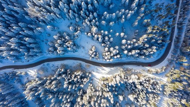 Sarıalan bölgesinde bulunan ağaçlar ile yol kenarlarındaki alanlarda oluşan kar manzarası, havadan görüntülendi.