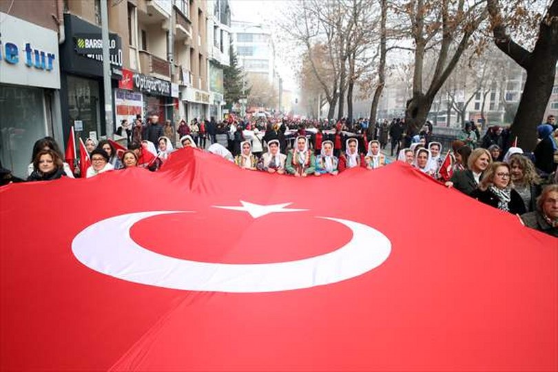 Kışla Parkı önünde bir araya gelen kadın dernekleri üyeleri ile vatandaşlar önlerinde kağnı, ellerinde Türk bayraklarıyla Cumhuriyet Meydanı’na kadar yürüdü.