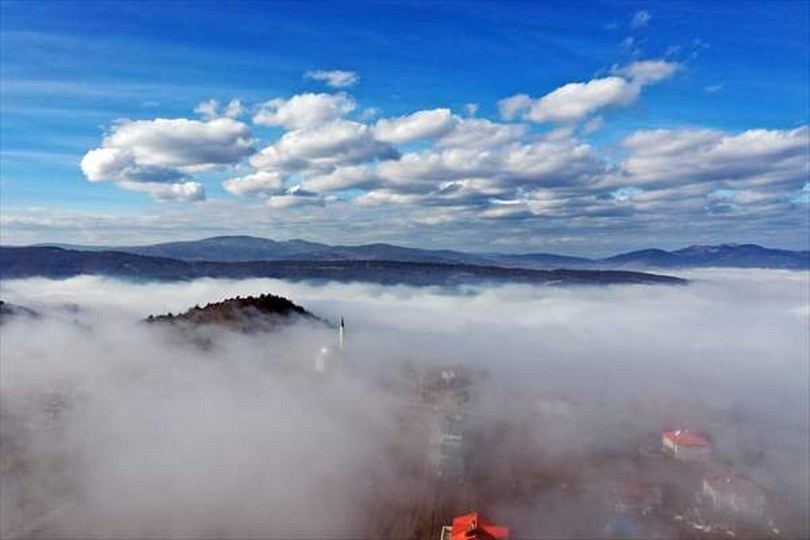 Kentin üzerinde sis bulutuyla bütünleşen manzara, dronla görüntülendi.