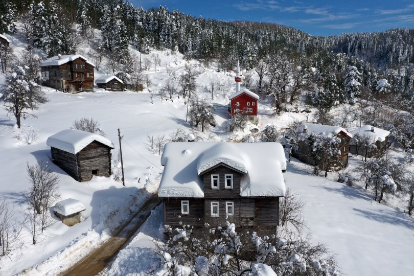 Kentin özellikle Küre Dağları bölümünde bulunan, birçoğu bir asrın üzerindeki ahşap evler, kar yağışıyla beyaza büründü.