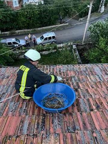 İlçeye bağlı Ortalıca köyünde şiddetli rüzgar nedeniyle bir evin çatısındaki güneş sistemi üzerindeki leylek yuvası dağıldı, içindeki yavrular çatıya düştü.