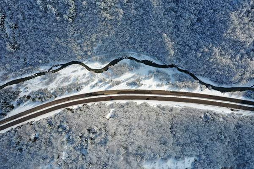 Kar ile birleşen çam ağaçlarının oluşturduğu manzara dron ile görüntülendi.