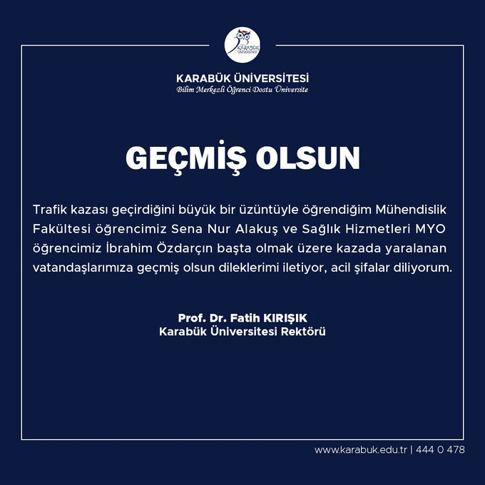 Geçtiğimiz günlerde 100. Mahallesi Jandarma Kavşağı mevkiinde meydana gelen kazada yaralanan KBÜ’lü öğrenciler için KBÜ Rektörü Prof. Dr. Fatih Kırışık geçmiş olsun mesajı yayımladı.