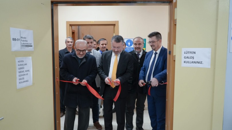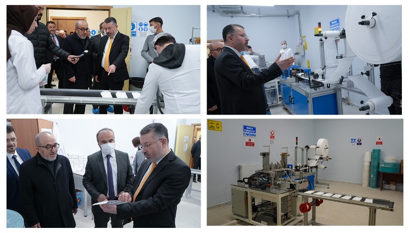 KBÜ Rektörü Prof. Dr. Fatih Kırışık, açılışı yapılan Model Fabrika Laboratuvarında incelemelerde bulundu ve maske üretimi hakkında bilgi aldı.