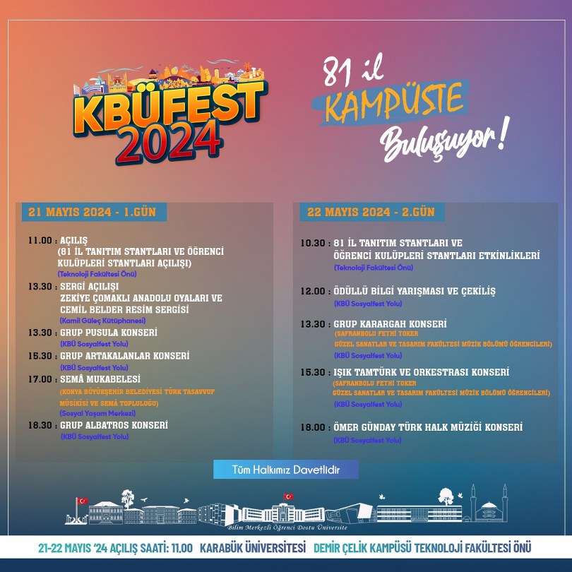 Karabük Üniversitesinin ev sahipliğinde düzenlenecek Türkiye’nin kültürel zenginlik ve çeşitliliğini ortaya koyacak KBÜFEST, 21-22 Mayıs’ta gerçekleşecek.