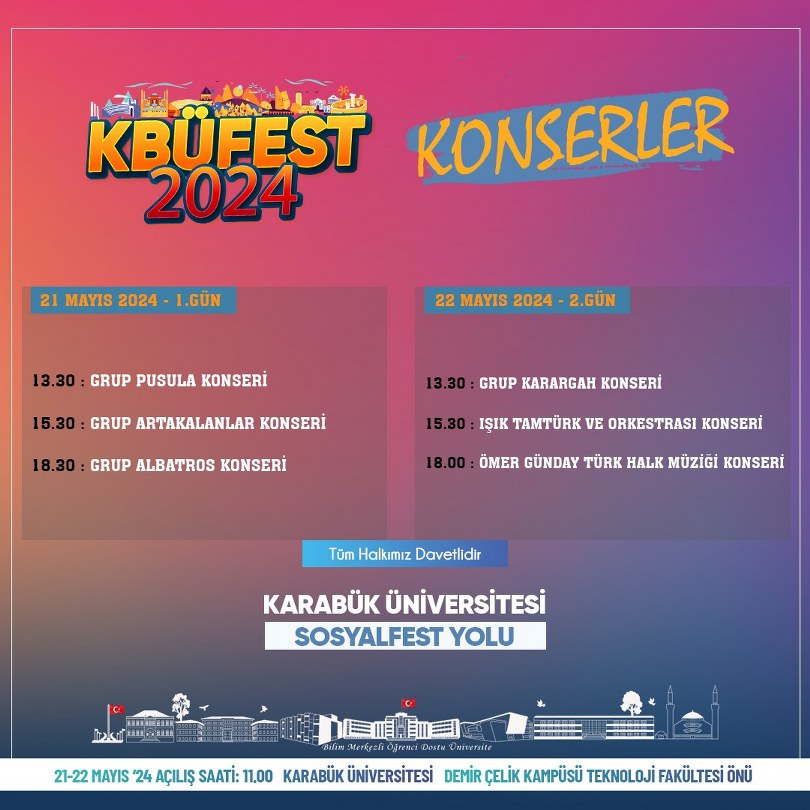 KBÜFEST’in ikinci gününde stant etkinlikleri, ödüllü bilgi yarışması ve çekiliş, Safranbolu Fethi Toker Güzel Sanatlar ve Tasarım Fakültesi Müzik Bölümü öğrencilerinden oluşan Grup Karargah ve Işık Tamtürk ve Orkestrası Konseri yapılacak olan KBÜFEST, Ömer Günday Türk Halk Müziği Konseri ile sona erecek.