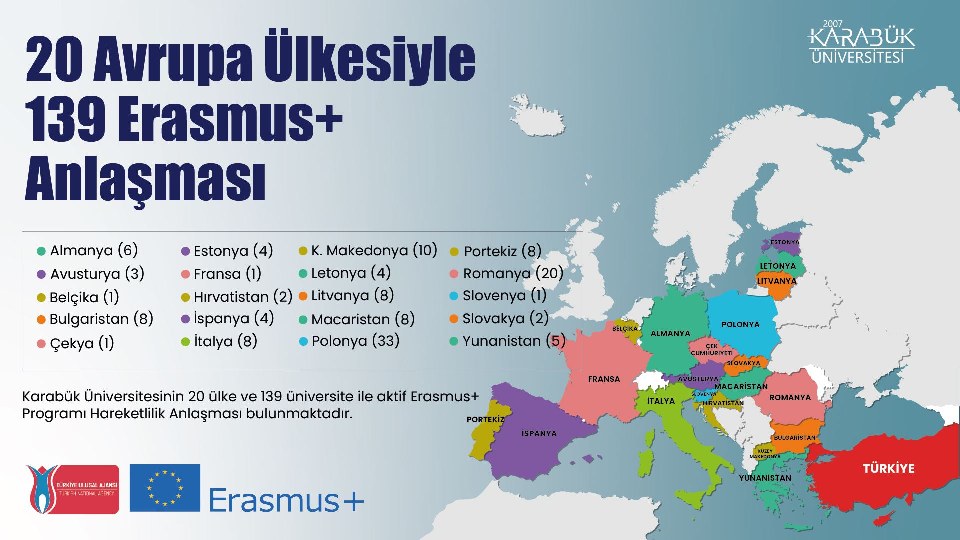 KBÜ, Erasmus+ KA131 projeleri sayesinde Polonya, Almanya, İtalya, Fransa, Romanya, Çekya, Letonya, Litvanya, Slovakya, Kuzey Makedonya, Portekiz, Yunanistan, Hırvatistan ve İspanya gibi pek çok ülkeyle akademik iş birliği yürütüyor.