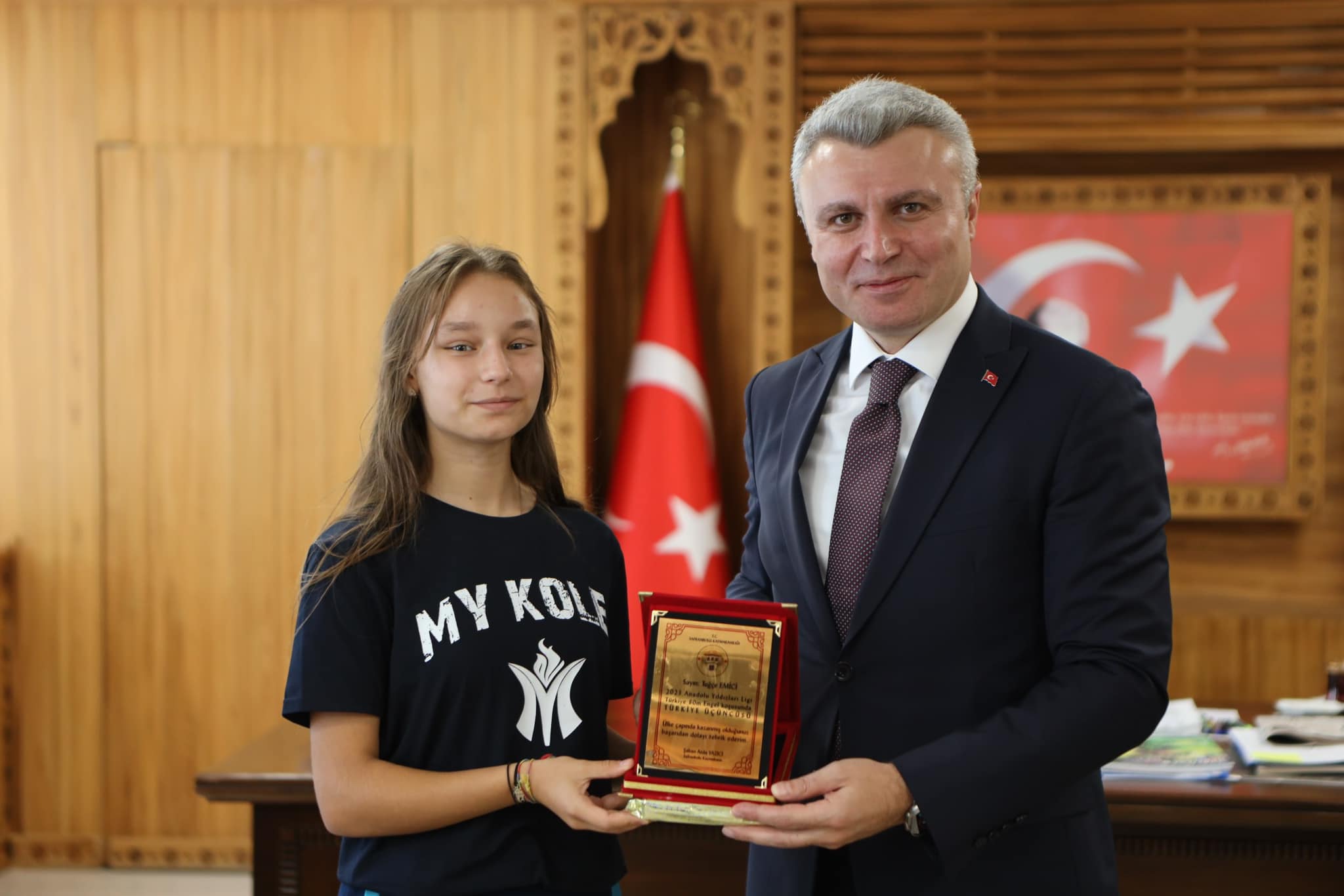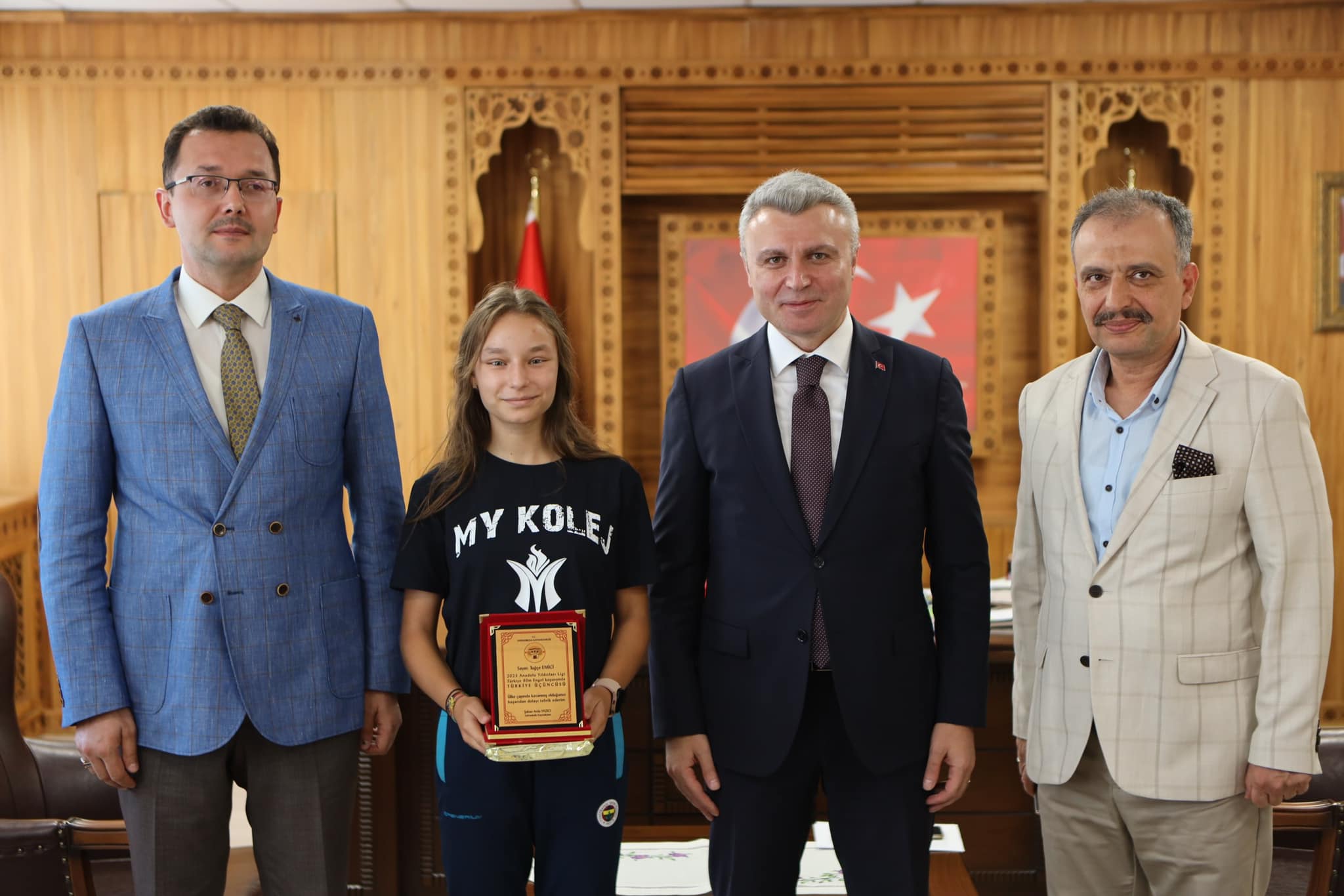 2023 Anadolu Yıldızlar Ligi Türkiye 80m Engel Koşusunda Türkiye Üçüncüsü olan 9. Sınıf öğrencisi Tuğçe Emici, Safranbolu Kaymakamı Şaban Arda Yazıcı’yı makamında ziyaret etti.