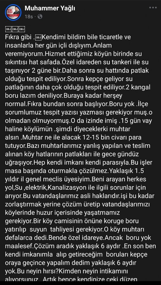 Sorunun çözümü için gerekli malzemelerin temininde yaşanan gecikmelere de dikkat çeken Yağlı, “2 kangal boru lazım deniliyor. Buraya kadar herşey normal. Fıkra bundan sonra başlıyor. Boru yok. İlçe sorumlumuz tespit yazısı yazması gerekiyormuş. O olmadan olmuyormuş. O da izindeymiş 15 gün vay haline köylüm” diyerek bürokratik engelleri eleştirdi.