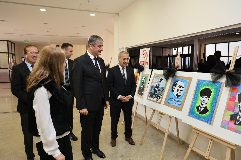 Program öncesinde 100. Yıl Kültür Merkezi fuaye alanında, Vakıfbank Zübeyde Hanım Anadolu Lisesi öğrencileri tarafından hazırlanan “Atatürk” konulu resim sergisi gezildi. Vali Mustafa Yavuz, sergiyi inceleyerek emeği geçen öğretmen ve öğrencileri tebrik etti.