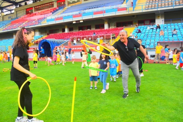 Çocuklar üzerinde spor kültürünü sevdirmek ve ekip ruhunu spor yaparak kazandırmak amacıyla Dr. Necmettin Şeyhoğlu Stadyumu’nda 100 öğrencinin katılımıyla düzenlenen şenlikte çocuklar antrenörler nezaretinde eğlence parkurlarında ve spor istasyonunda hem eğlendi hem de spor yaptı.