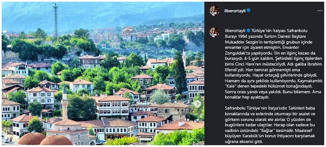 Prof. Dr. İlber Ortaylı, Instagram hesabında yayımladığı yazıda Safranbolu’nun tarihsel dokusunu, korunmuş kent kimliğini ve yanlış turizm uygulamalarının doğurabileceği riskleri detaylı şekilde ele aldı. Ortaylı, Safranbolu’yu “Türkiye’nin İtalyası” olarak tanımlayarak ilçenin mimari ve kültürel yapısının Anadolu’da özel bir yere sahip olduğunu vurguladı.