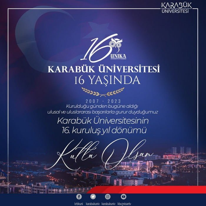 “29 Mayıs 2007 yılında kurulan Karabük Üniversitesi (KBÜ), geleceğin mesleklerine uygun kaliteli eğitim misyonu ve uluslararasılaşmada lider Üniversite olma yolu vizyonuyla çalışmalarını hız kesmeden sürdürmektedir. Donanımlı, özverili, gayretli, iş dünyasının ihtiyaç duyduğu bilgi ve yeteneklere sahip, değerlerine bağlı bireyler yetiştirmek Üniversitemizin en temel gayesidir. Öğrencilerimizin mezunu olduklarında gurur duyduğu bir Üniversite olmak için tüm gücümüzle çalışıyoruz. 100 farklı ülkeden 12 bini aşkın uluslararası öğrenciyi bünyesinde barındıran ve Türkiye’de en fazla uluslararası öğrenciye sahip olan Üniversite konumunda bulunuyoruz. Uluslararası başarılarımızın yanında Türkiye’de de üniversite–sanayi iş birliğine örnek çalışmalar yapan, yeşil ve akıllı kampüs ile öğrencilerimize imkanlar sunan, teknoloji yarışmalarına her sene çokça öğrencisi katılan ve mezunu en hızlı iş bulan üniversiteler arasında olmayı sürdürüyoruz. Bu duygu ve düşüncelerle Karabük Üniversitesinin kurulmasında ve kısa zamanda önemli başarılara imza atarak bugünlere gelmesinde katkısı olan başta merhum Prof. Dr. Burhanettin Uysal olmak üzere hayatını kaybeden tüm çalışma arkadaşlarımıza Allah’tan rahmet diliyor, kıymetli mesai arkadaşlarıma, Üniversitemiz akademik ve idari personeline, desteklerini esirgemeyen kıymetli Karabüklülere, sanayicilerimize, Karabük Üniversitesinin dünya üniversiteleri arasında saygın konumda olmasına katkı sunan herkese teşekkür ediyor, Karabük Üniversitesi ailesi adına Üniversitemizin kuruluşunun 16. yıl dönümünü en içten dileklerimle kutluyorum.“