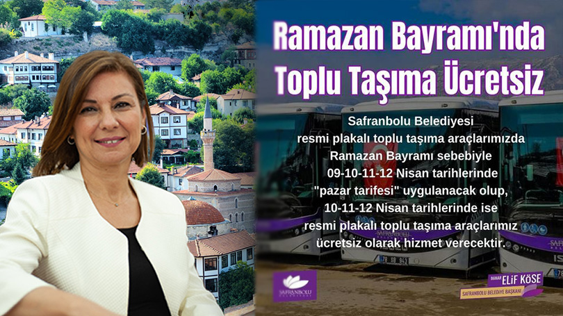 Safranbolu Belediyesi’nin sosyal medya hesabından yapılan açıklamaya göre, “Safranbolu Belediyesi resmi plakalı toplu taşıma araçlarımızda Ramazan Bayramı sebebiyle 09-10-11-12 Nisan tarihlerinde ‘pazar tarifesi’ uygulanacak olup, 10-11-12 Nisan tarihlerinde ise resmi plakalı toplu taşıma araçlarımız ücretsiz olarak hizmet verecektir.” ifadeleri kullanıldı.