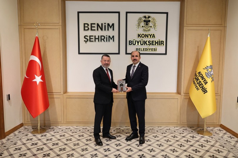 Ziyaretin sonunda, Konya Büyükşehir Belediye Başkanı Uğur İbrahim Altay, Rektör Prof. Dr. Fatih Kırışık’a hediye takdim etti.