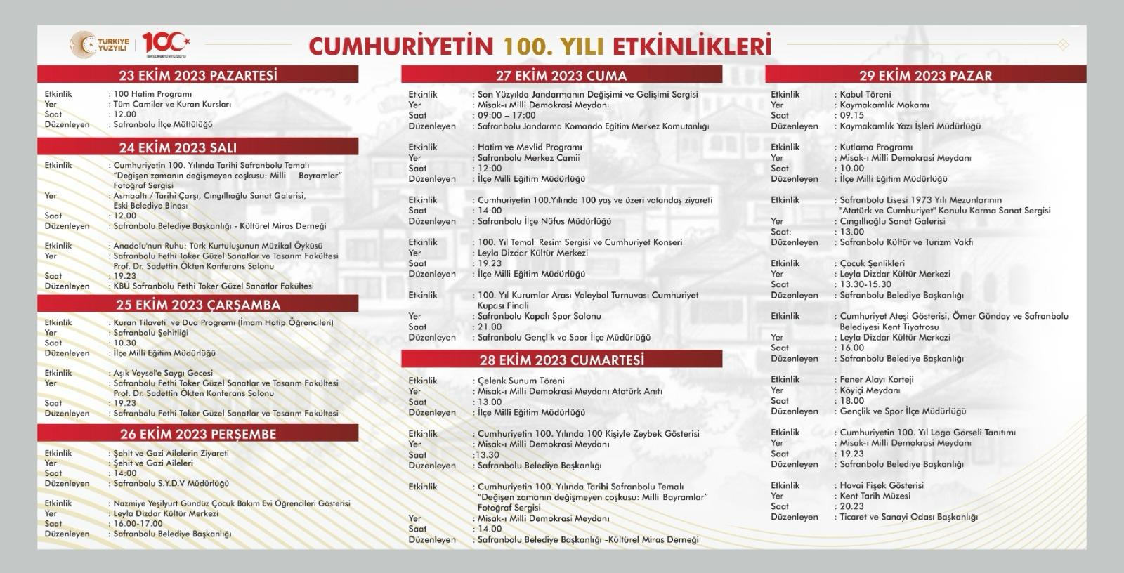 Cumhuriyetin 100. Yılına sayılı günler kala Safranbolu bu büyük coşkuyu yaşamaya hazırlanıyor. 100. Yıl programları kapsamında vatandaşları birçok etkinlik bekliyor. Safranbolu Kaymakamlığı, Safranbolu Belediyesi, Safranbolu Orman İşletme Müdürlüğü, Safranbolu Kültür ve Turizm Vakfı ile kurumların ortaklaşa düzenleyeceği faaliyetler Cumhuriyet’in 100. yılına girdiğimiz 23 Ekim Pazartesi günü itibari ile başladı. 23-24-25 Ekim tarihlerinde 100 Hatim, Cumhuriyetin 100. Yılında Tarihi Safranbolu Temalı “Değişen Zamanın Değişmeyen Coşkusu: Milli Bayramlar” Fotoğraf Sergisi, Anadolu’nun Ruhu: Türk Kurtuluşunun Müzikal Öyküsü gibi programlar yer aldı.