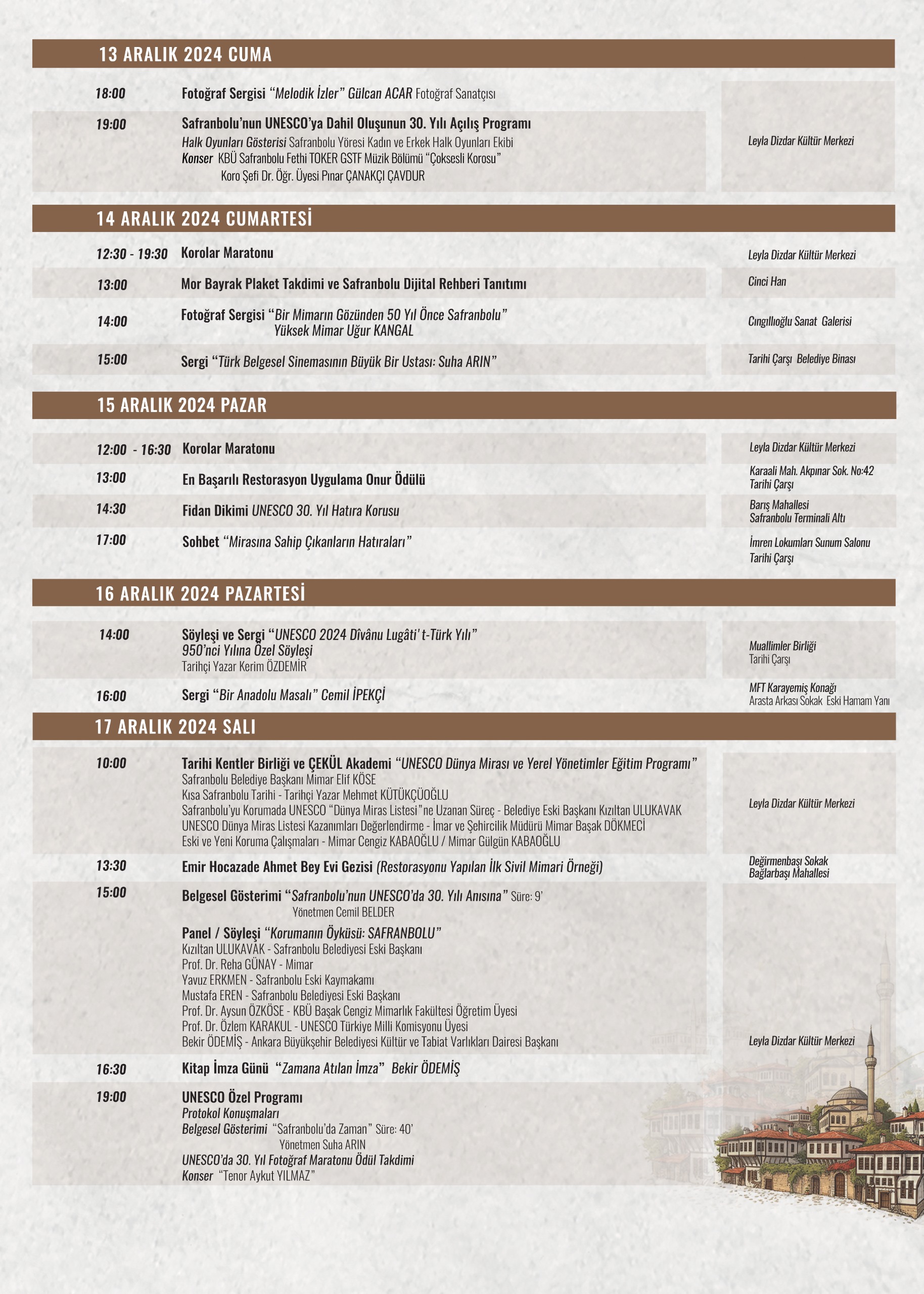 Safranbolu Belediyesi tarafından düzenlenecek etkinlikler, şehrin eşsiz mirasını bir kez daha dünyaya tanıtmayı ve uluslararası prestijini artırmayı hedefliyor. Kutlama programı kapsamında paneller, sergiler, korolar maratonu, fotoğraf maratonu, imza günleri, fidan dikimi, belgesel gösterimleri ve söyleşiler yer alacak.