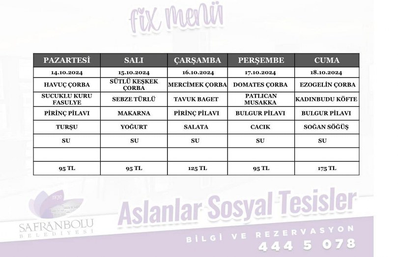 Safranbolu Belediyesi Aslanlar Sosyal Tesisleri, uygun fiyatlı, kaliteli ve hijyenik bir ortamda fix menü fırsatını sunuyor.