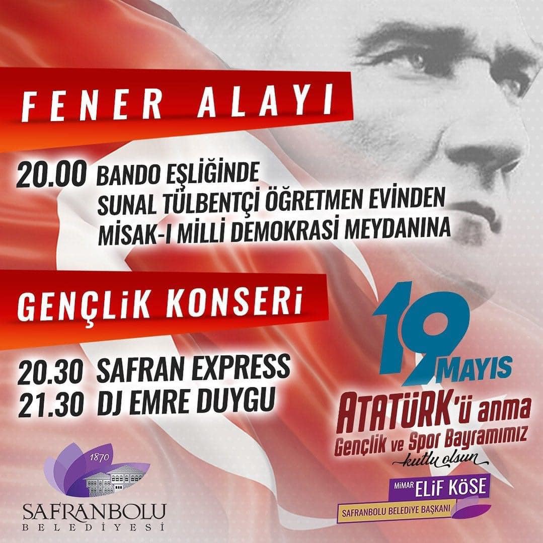 19 Mayıs Atatürk’ü Anma Gençlik ve Spor Bayramı münasebetiyle Safranbolu Belediyesi tarafından bugün saat 20:00’de bando eşliğinde Sunal Tülbençi Öğretmenevi’nden başlayan ve Misak-ı Milli Demokrasi Meydanı’nda son bulan fener alayı düzenlenecek. Fener alayının akabinde Misak-ı Milli Demokrasi Meydanı’nda Safran Express ve DJ Emre Duygu’nun sahne alacağı gençlik konseri gerçekleştirilecek.