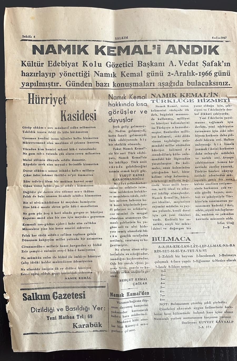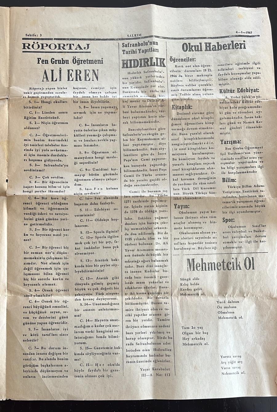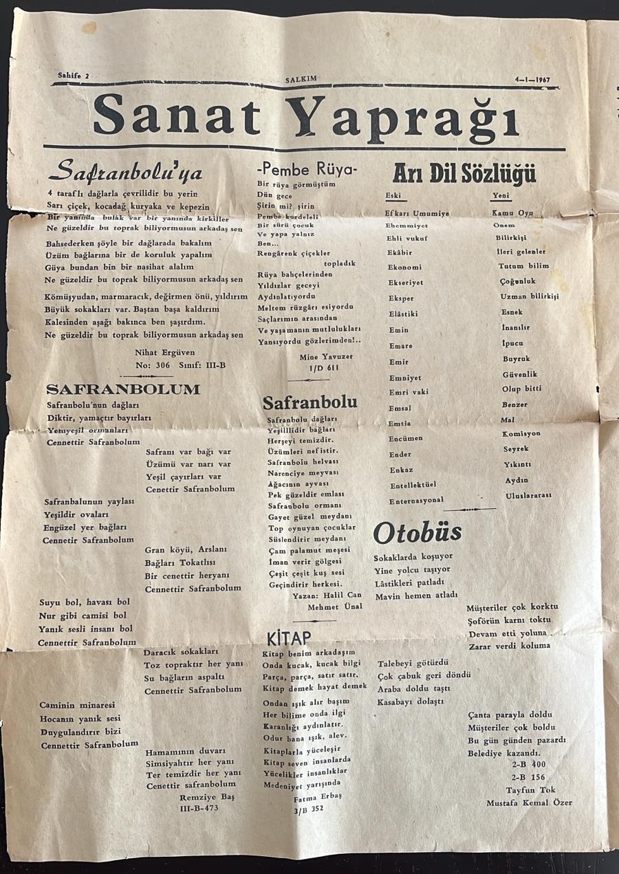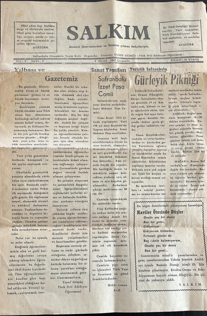 SAFRANBOLU – Safranbolu Ortaokulu Yayın Kolu tarafından çıkartılan ve Yusuf Gümüş (Türk Dili Edebiyatı Öğretmeni) yönetiminde hazırlanan Salkım Gazetesi, 59 yıl öncesinden bugünlere adeta bir ders veriyor. Gazetenin içeriği; şiirlerden röportajlara, “Arı Dil Sözlüğü”nden tarihi yapıların tanıtımına kadar geniş bir yelpazede, bugünün üniversite yayınlarını aratmayacak bir nitelik taşıyor.