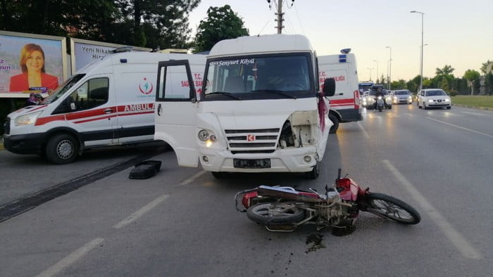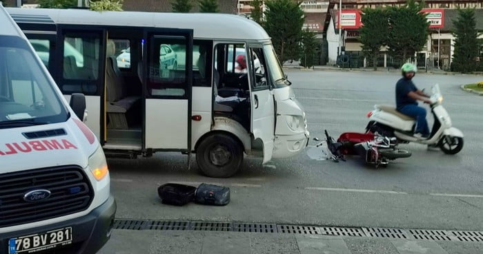 Safranbolu’dan Karabük istikametine giden, F.K. idaresindeki 78 S 9002 plakalı servis minibüsü, henüz belirlenemeyen nedenle Emek kavşağında kırımızı ışıkta bekleyen 34 FY 7459 ve 34 EFN 291 plakalı otomobiller ile 78 AAC 909 plakalı motosiklete çarptı.