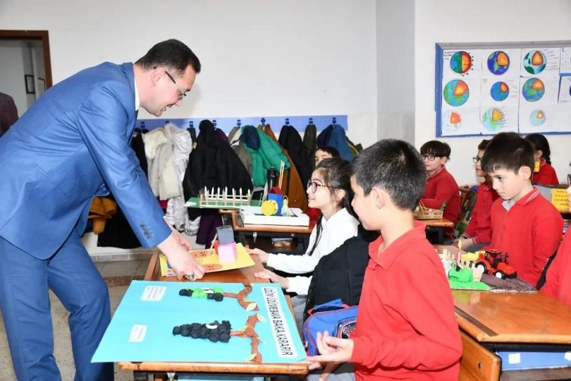 Proje çerçevesinde yapılan yarışmaları tek tek inceleyen, proje faaliyetleri kapsamında öğrencilerle yapılan eğitimlere katılan İlçe Milli Eğitim Müdürü Said Nuri Odabaşoğlu, Okul Müdürü Vedat Öztürk ve öğretmenlerden bilgi aldı.