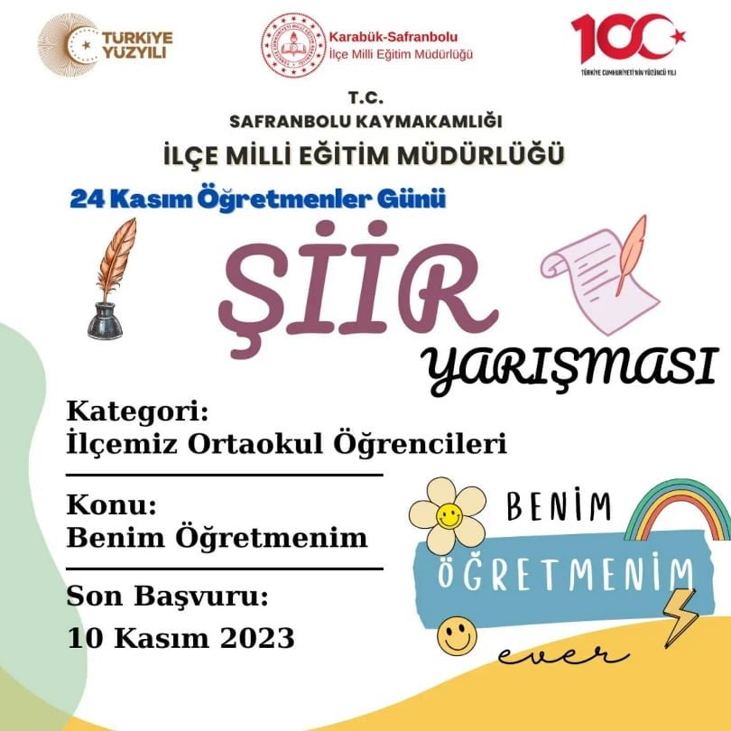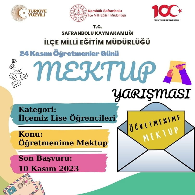Konuyla ilgili olarak Safranbolu İlçe Milli Eğitim Müdürlüğü’nden yapılan açıklamada, “Cumhuriyetimizin 100. Yılı ve Türkiye Yüzyılı vizyonuyla devam eden etkinlilerimiz kapsamında 24 Kasım Öğretmenler Günü münasebetiyle ilçemiz ilköğretim öğrencileri arasında ‘Öğretmenim ve Ben’ konulu bir resim yarışması, ilçemiz ortaokul öğrencileri arasında ‘Benim Öğretmenim’ konulu bir şiir yarışması, ilçemiz lise öğrencileri arasında Öğretmenime Mektup yarışması düzenlenmektedir. Yarışma için son başvuru tarihi 10 Kasım Cuma günüdür. Yarışmamıza ilçemizdeki tüm öğrencilerimiz davetlidir. Ödül töreni 24 Kasım Öğretmenler Gününde Leyla Dizdar Kültür Merkezinde gerçekleştirilecektir.” denildi.