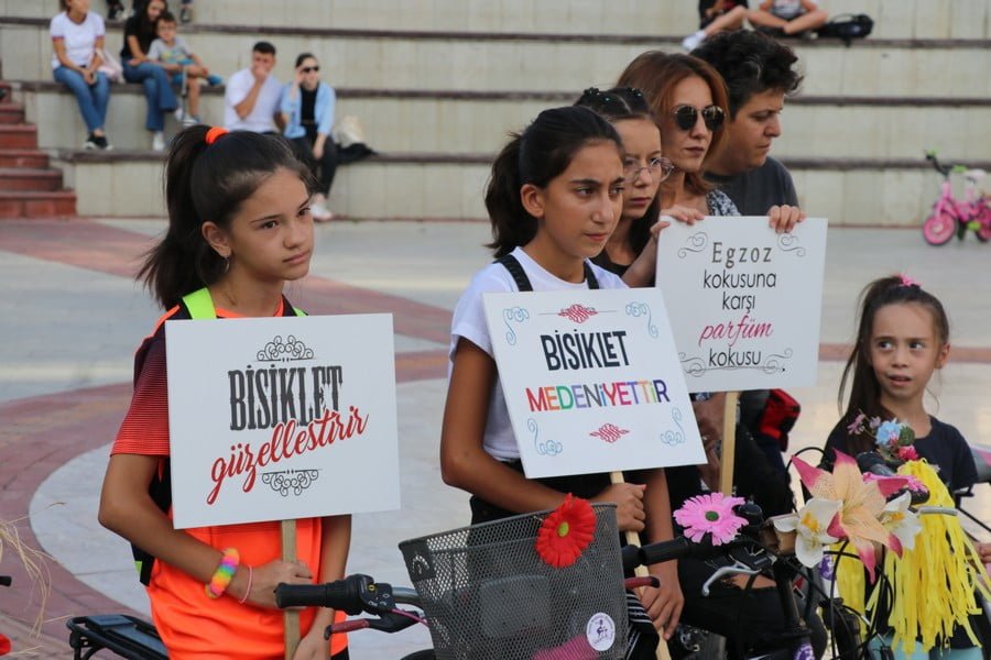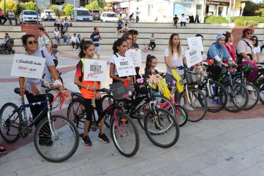 Misak-ı Milli Demokrasi Meydanı’nda bir araya gelen kadınlar, bisikletlerine “Bisiklet En İyi Psikologdur”, “Bisiklet Güzelleştirir” ve “Bisiklet Medeniyettir” yazılı dövizler astı.